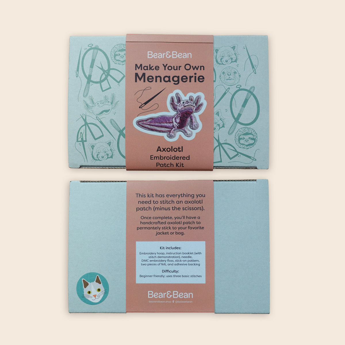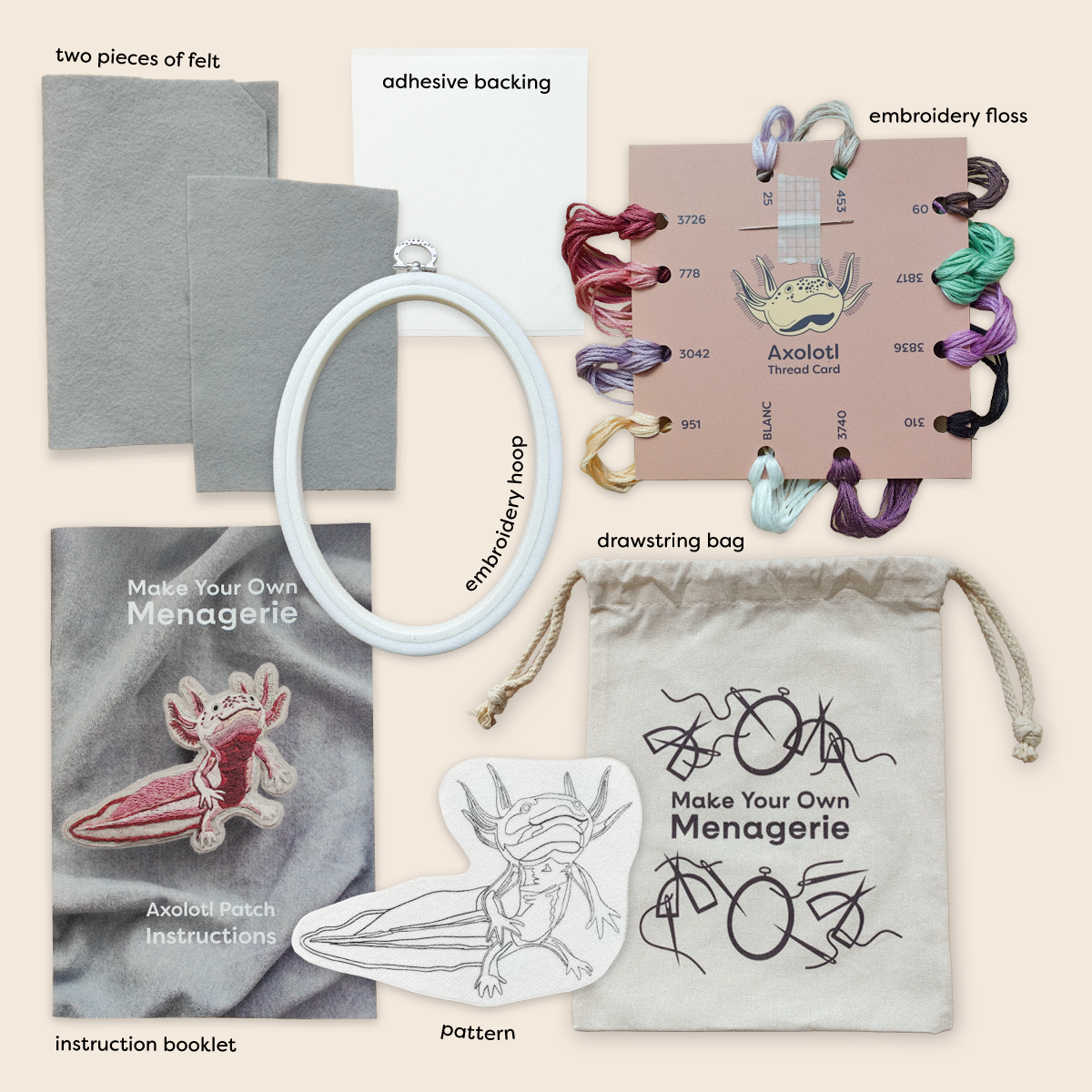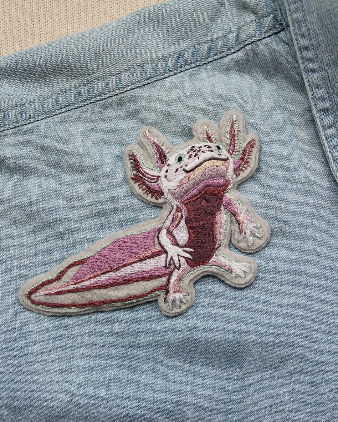 When you've completed the kit, you'll have a hand-crafted axolotl patch with a stick-on backing that will permanently adhere to any fabric surface.