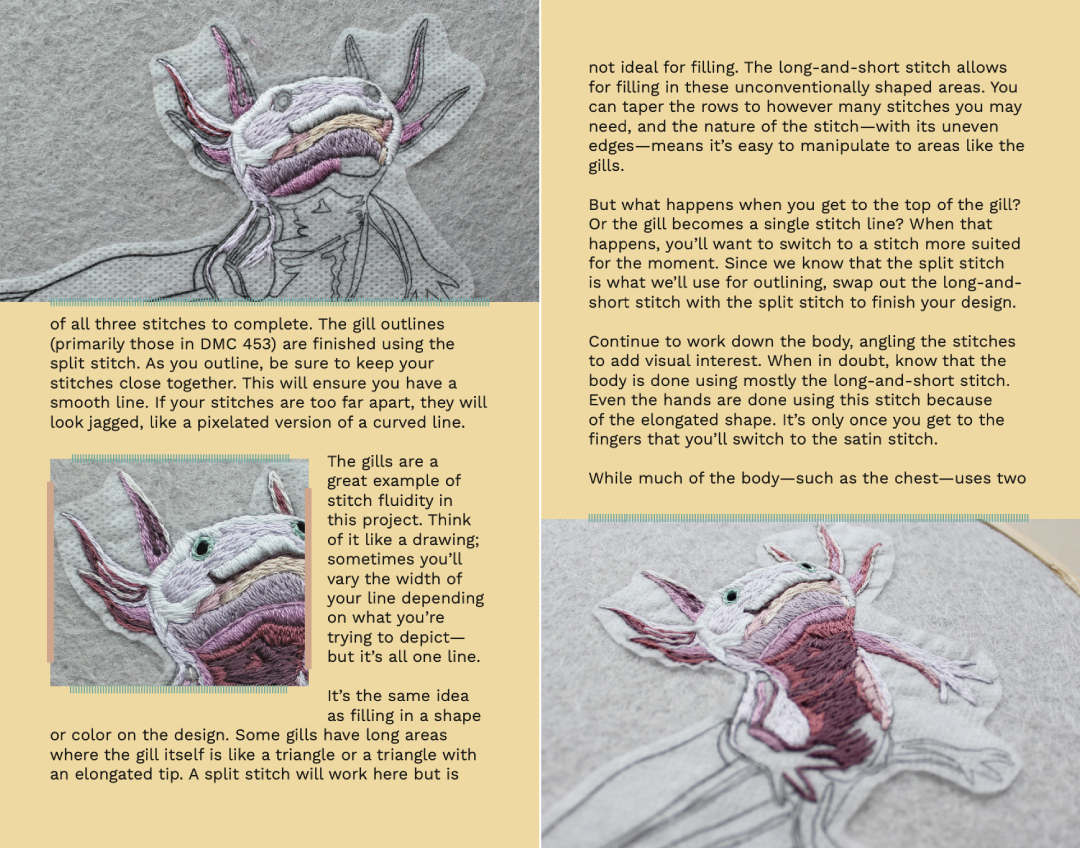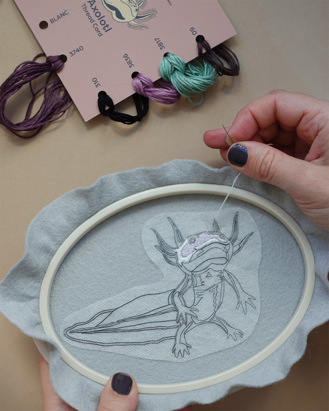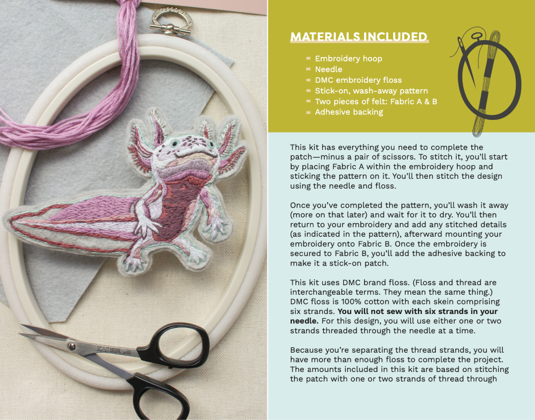 When you've completed the kit, you'll have a hand-crafted axolotl patch with a stick-on backing that will permanently adhere to any fabric surface.