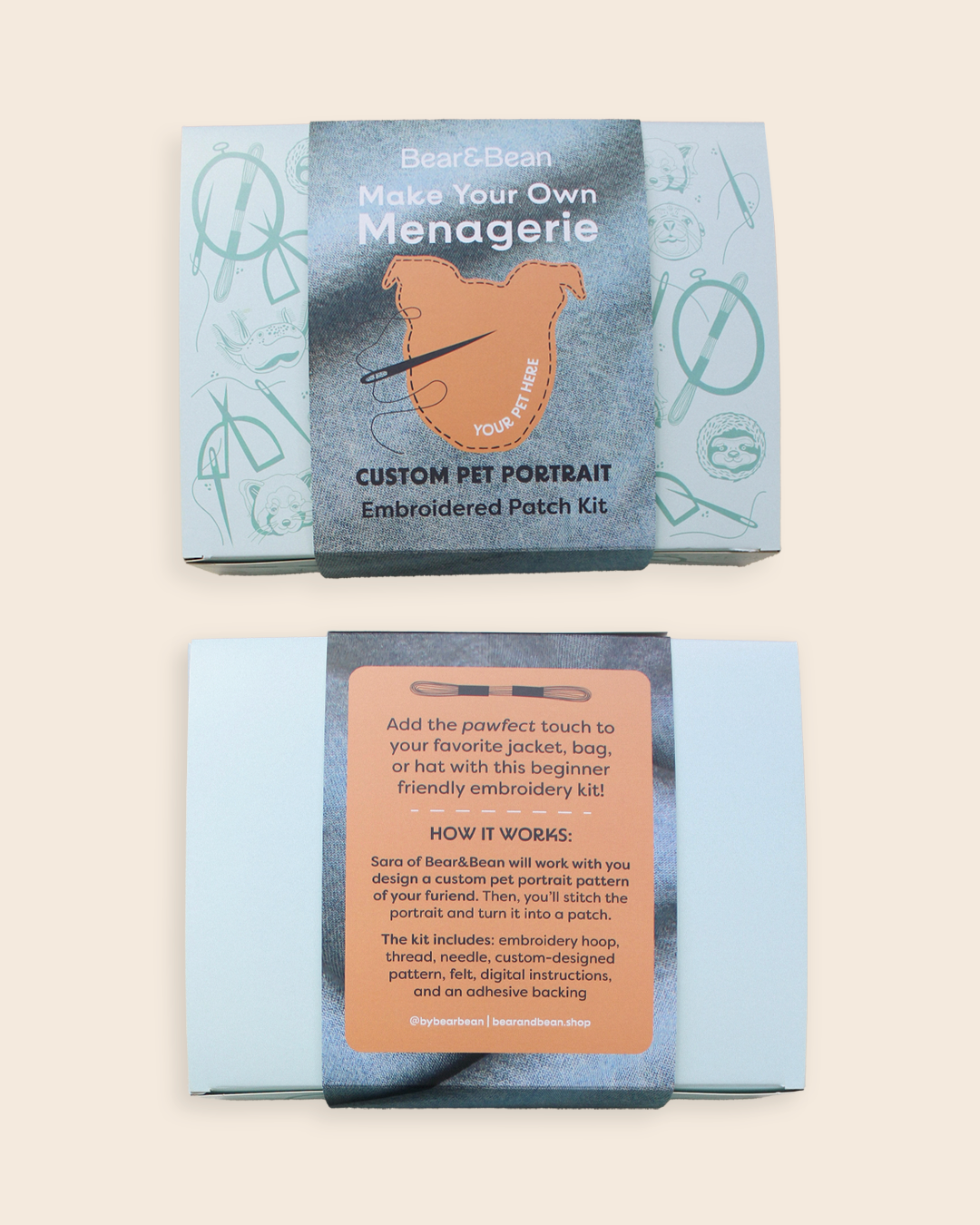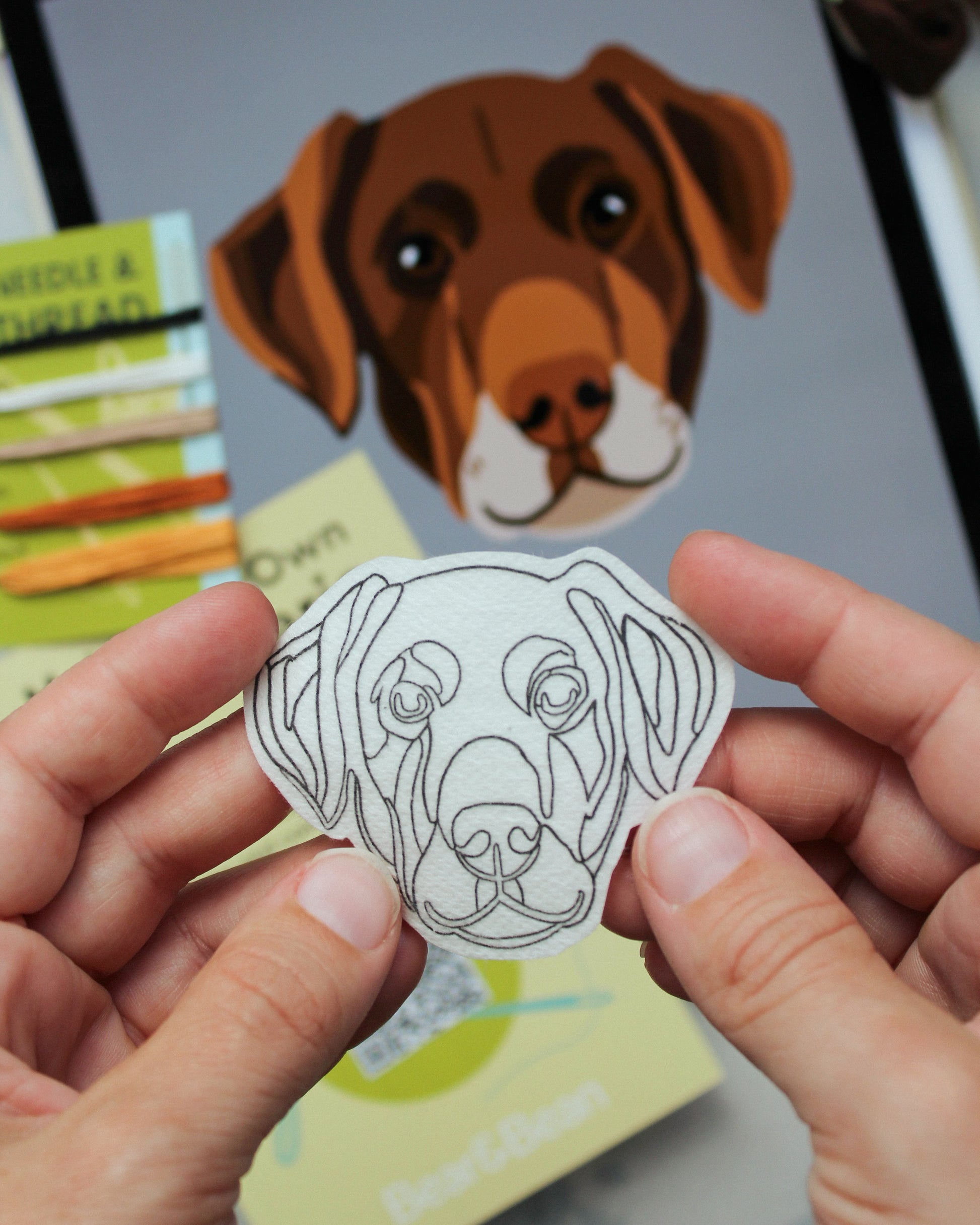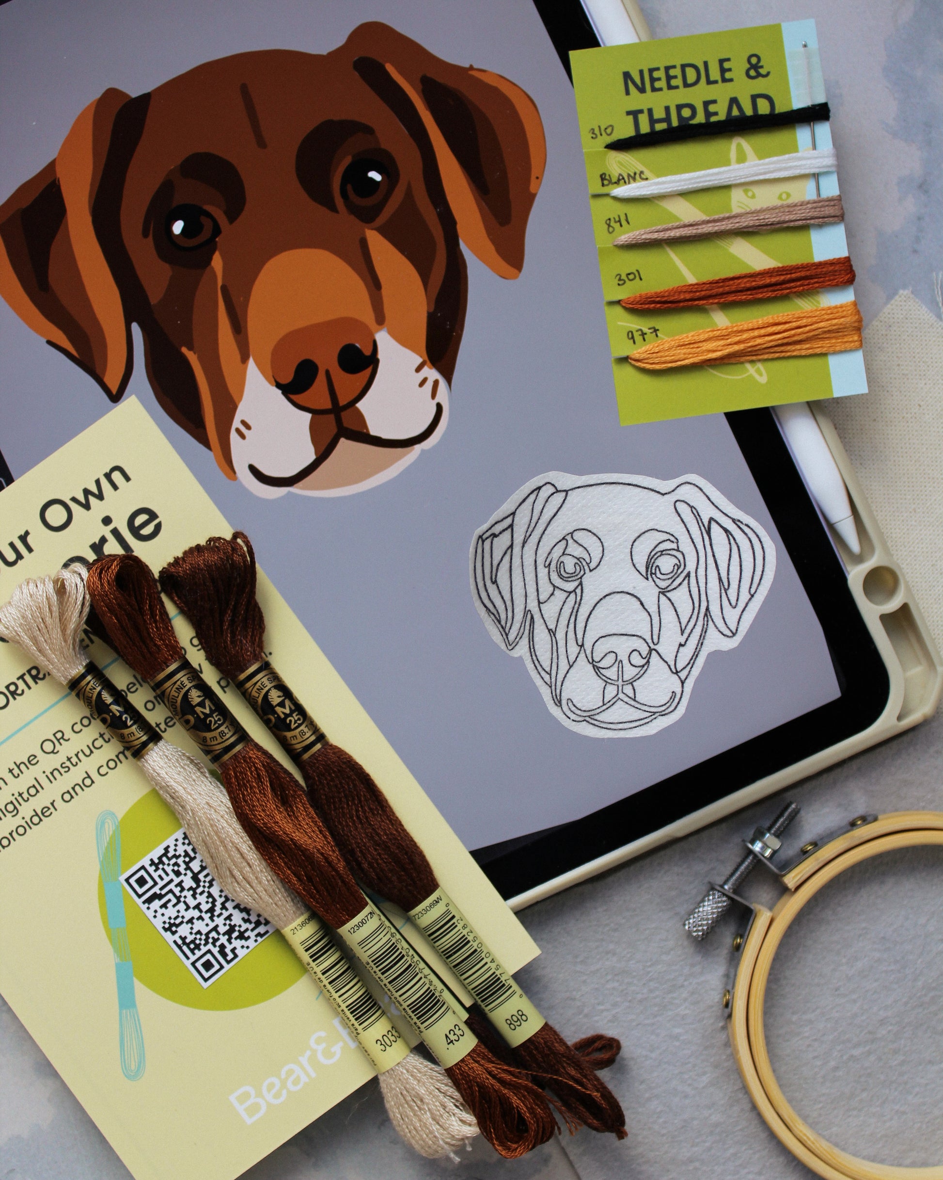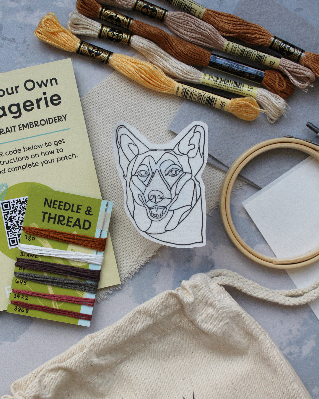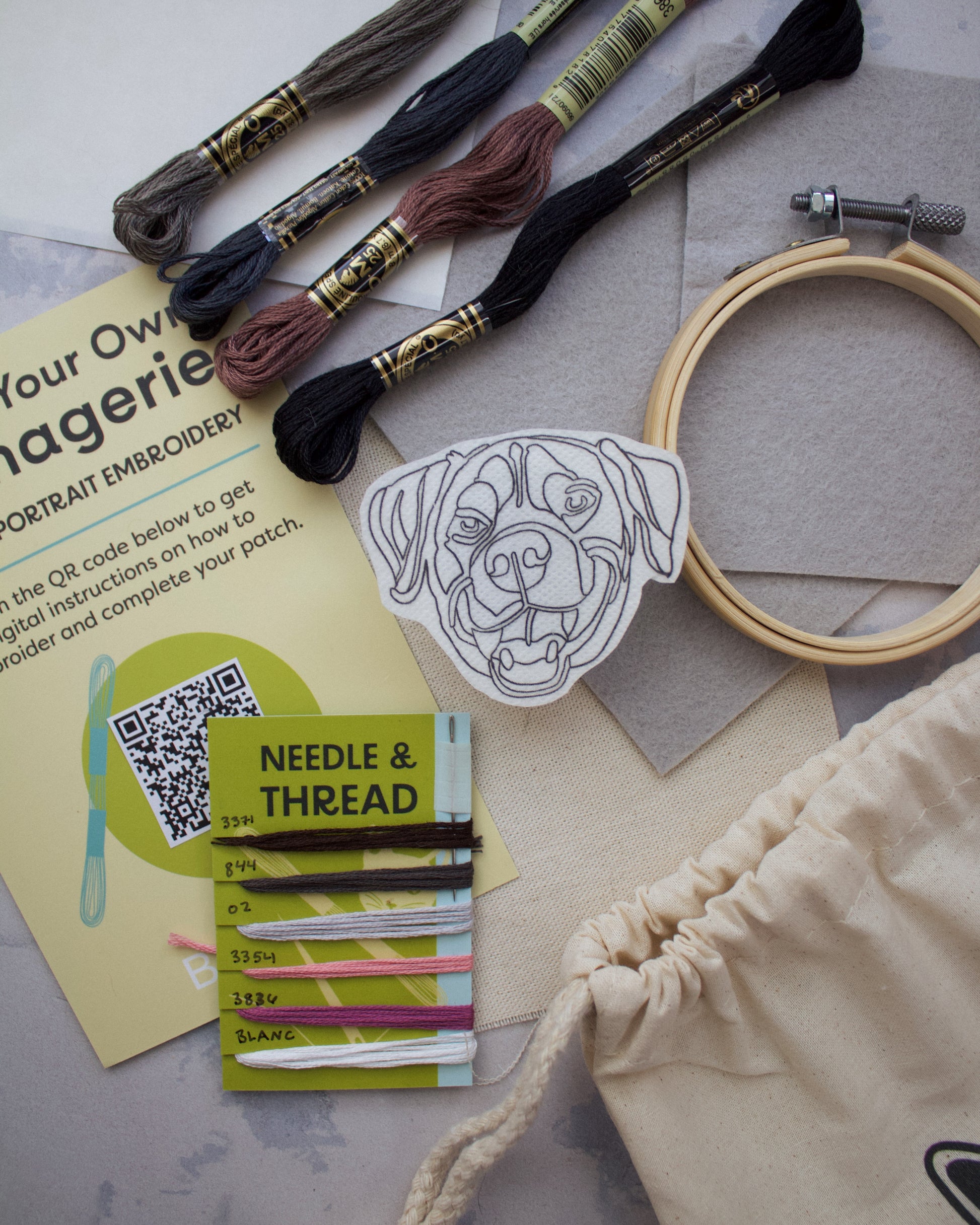 Perfect for a pet parent, this made-to-order kit includes everything you'll need to embroider your dog, cat, bunny, bird, fish, or reptile! When complete, the portrait will stick to a jacket, pair of jeans, or a backpack.