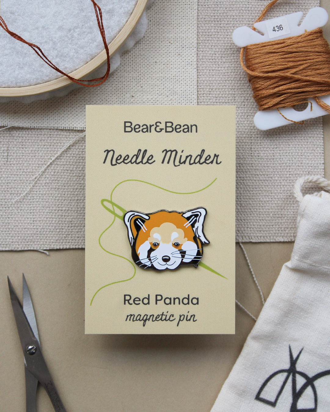 To use, simply separate the pin and place the magnet on the back of your project. Match the red panda head with the magnet. When you're done stitching, rest your needle on the needle minder to keep it safe and secure.