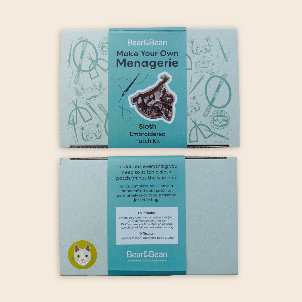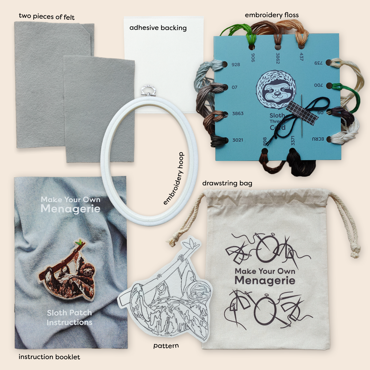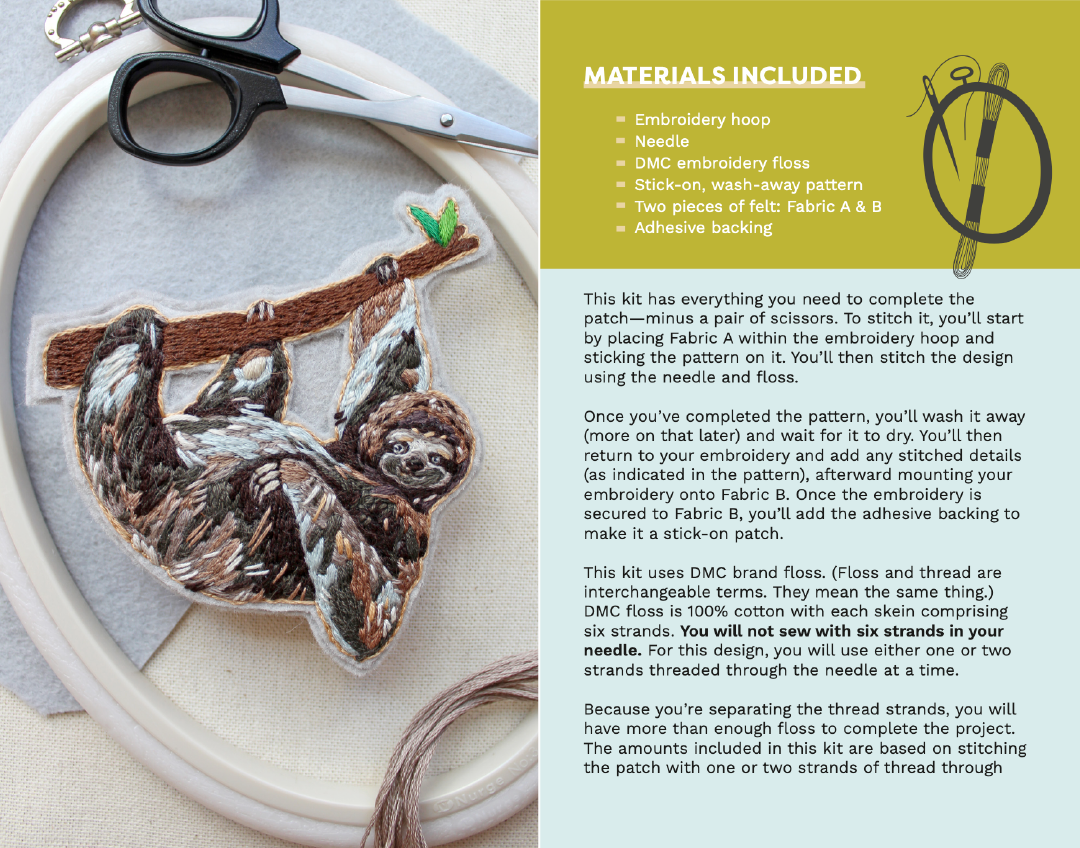 When you've completed this kit, you'll have a hand-crafted sloth patch with a stick-on backing that will permanently adhere to any fabric surface.